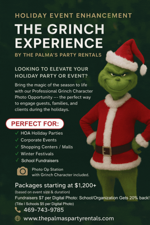The Palma’s Party Rentals offers a professional Grinch Character Photo Opportunity – a unique way to engage guests, families, and clients during the season.
